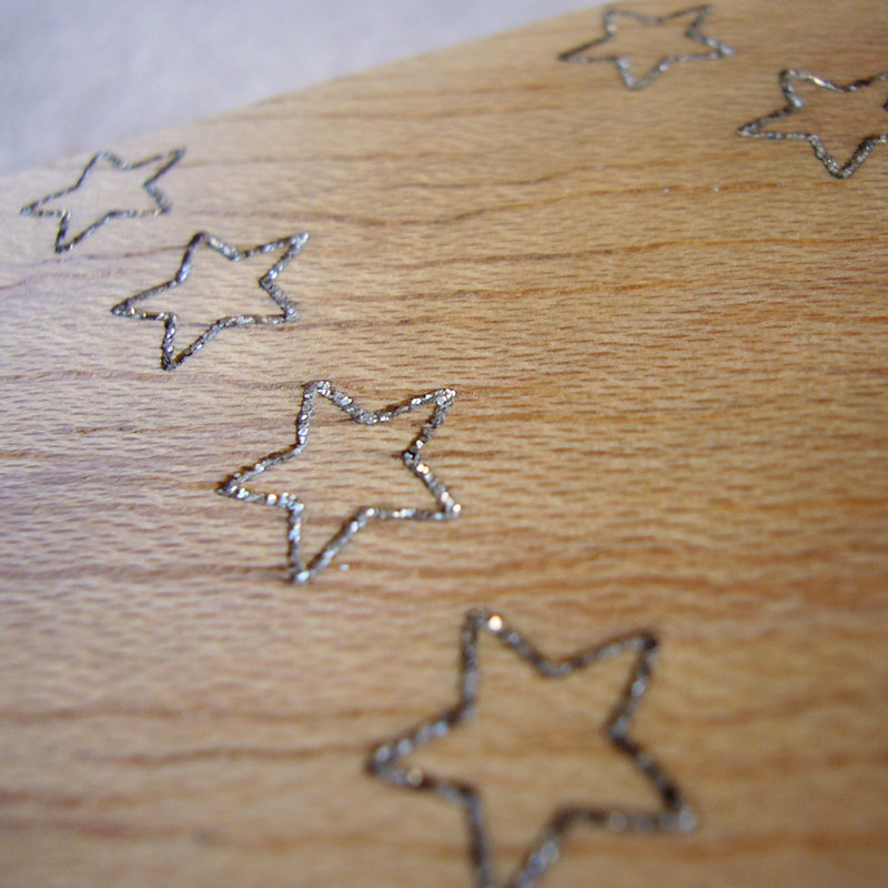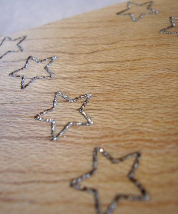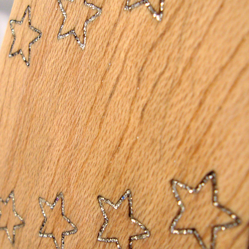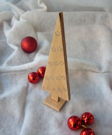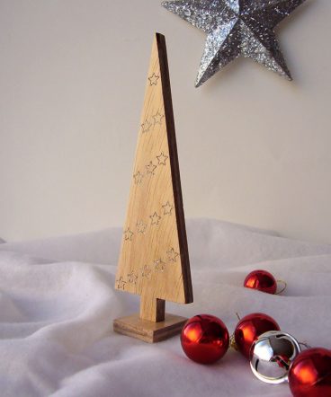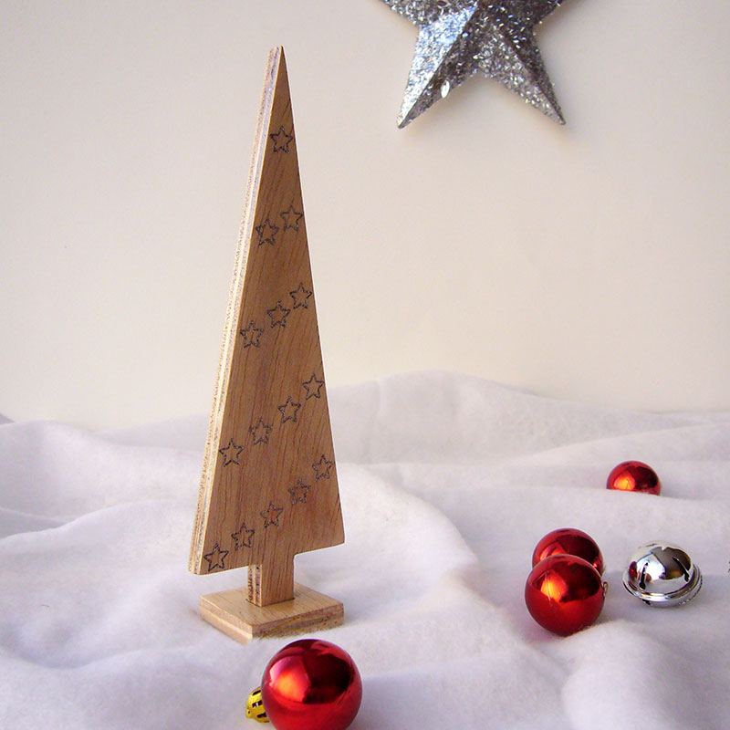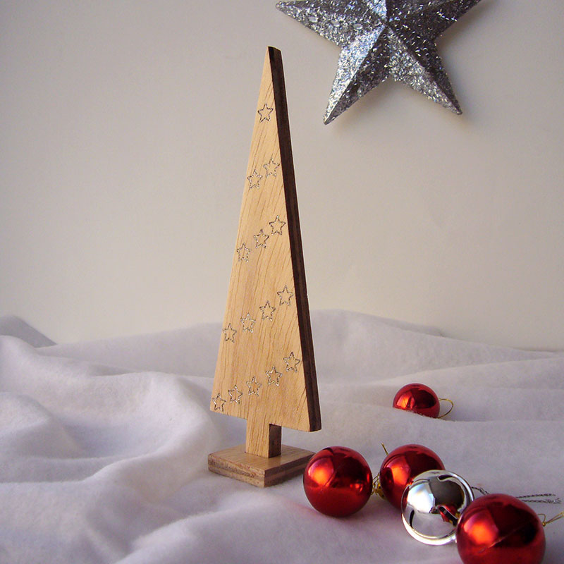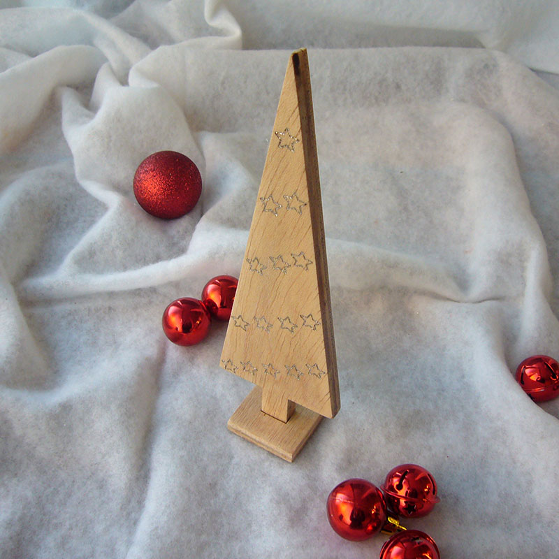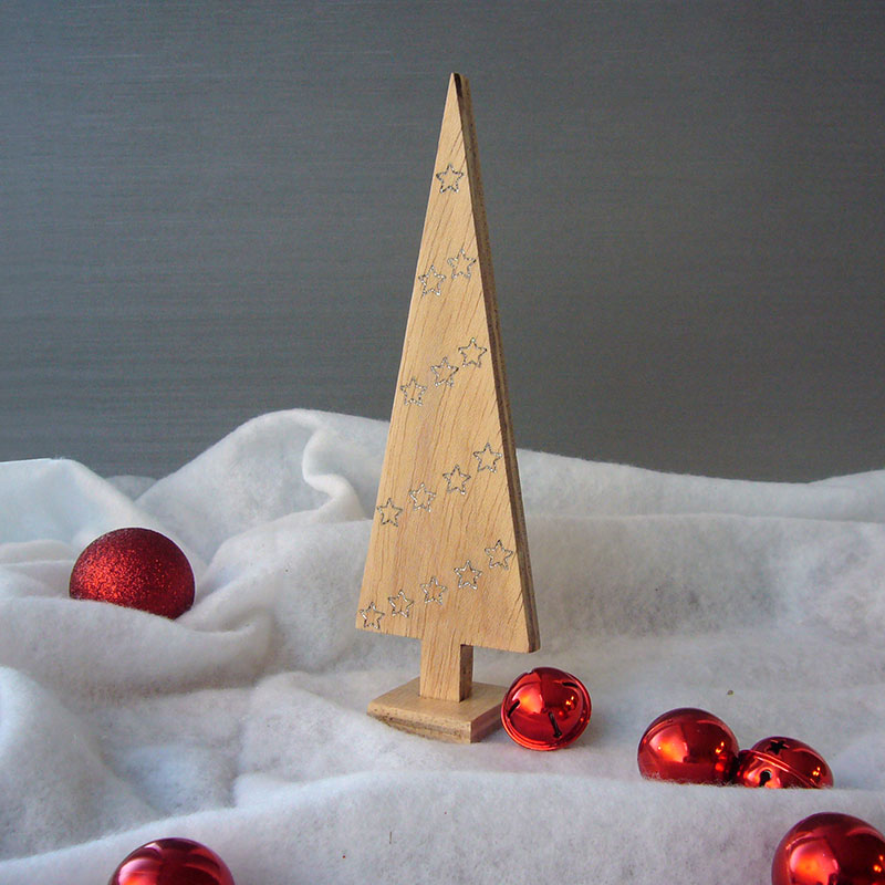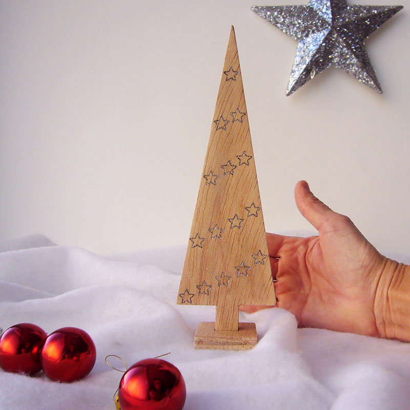 Arbol de navidad de madera con grabado con estrellitas en hueco y pintadas en plata metálico