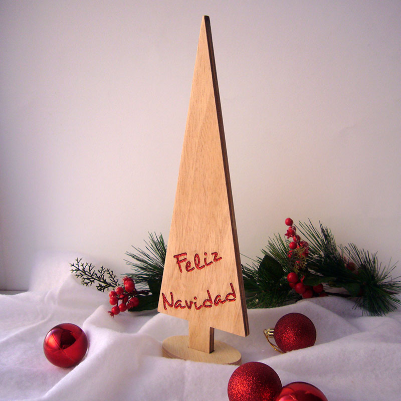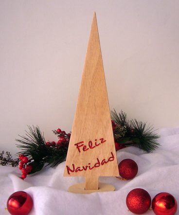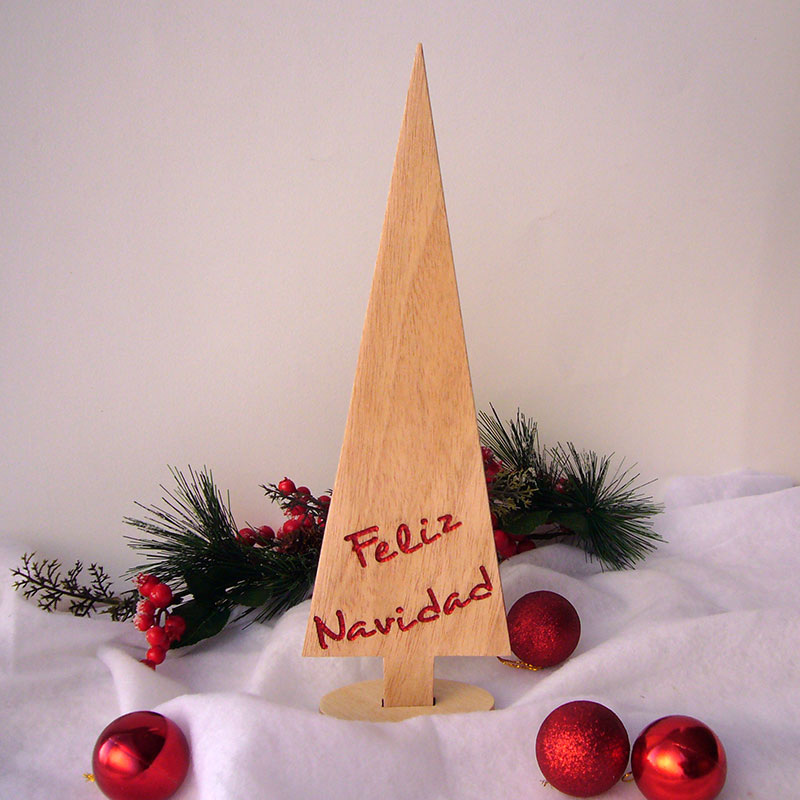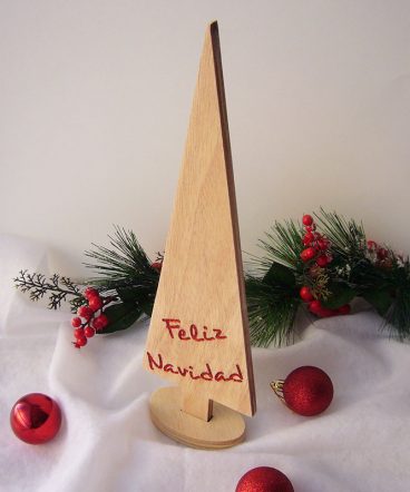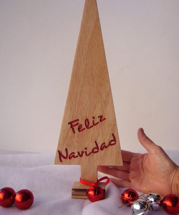 Arbol de navidad con grabado “Feliz Navidad” pintado en rojo purpurina