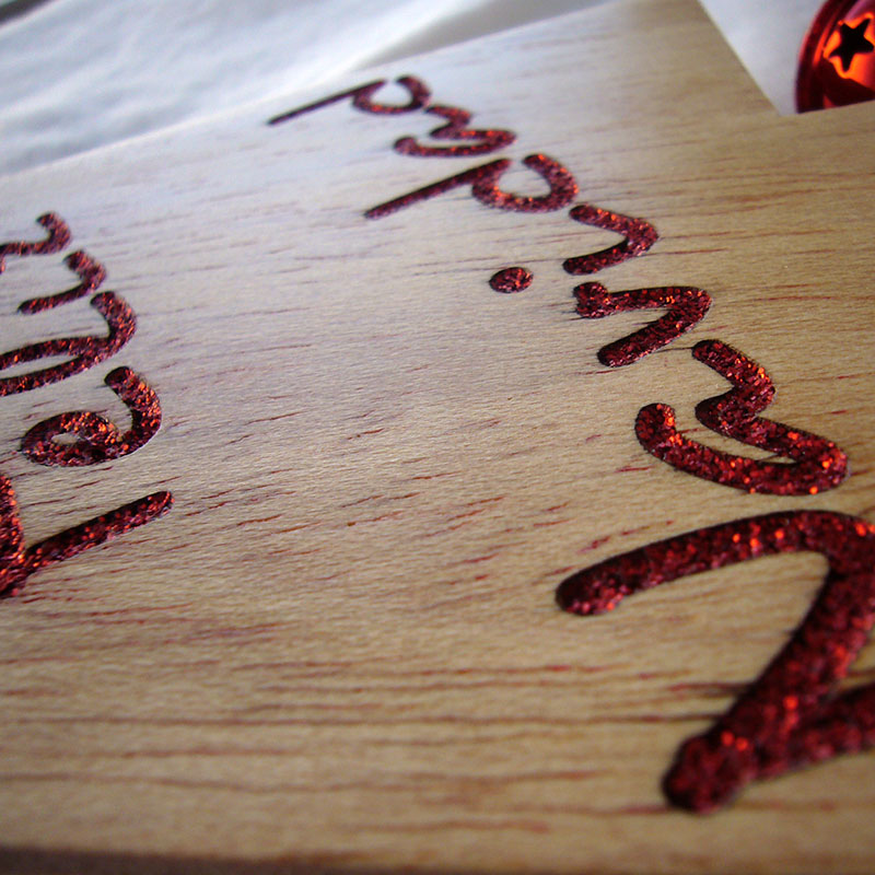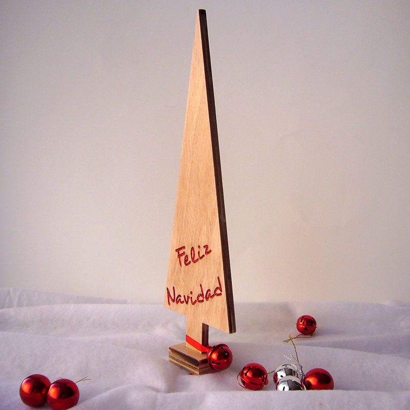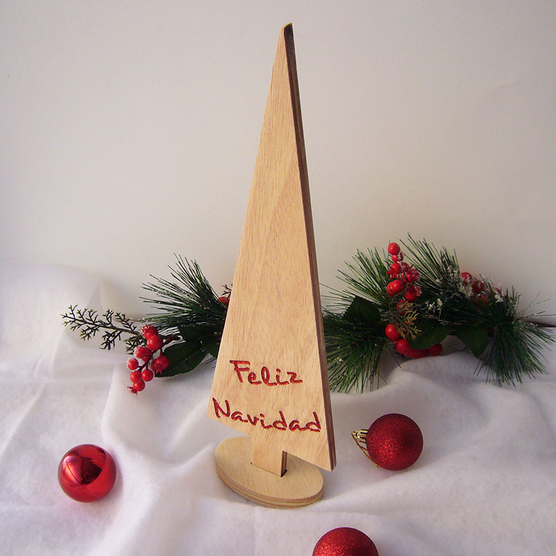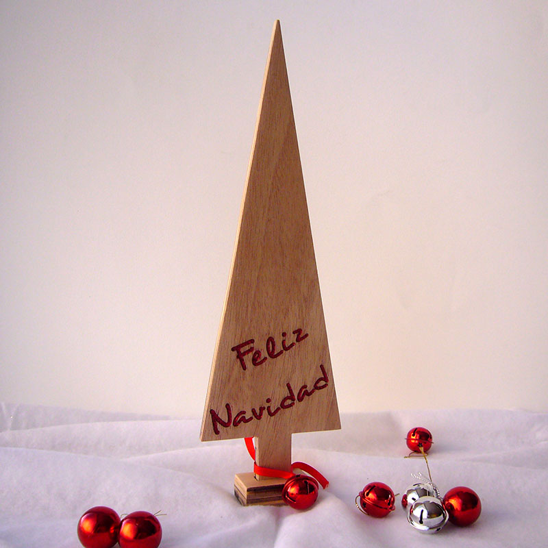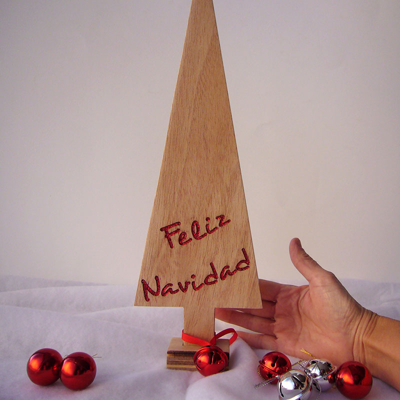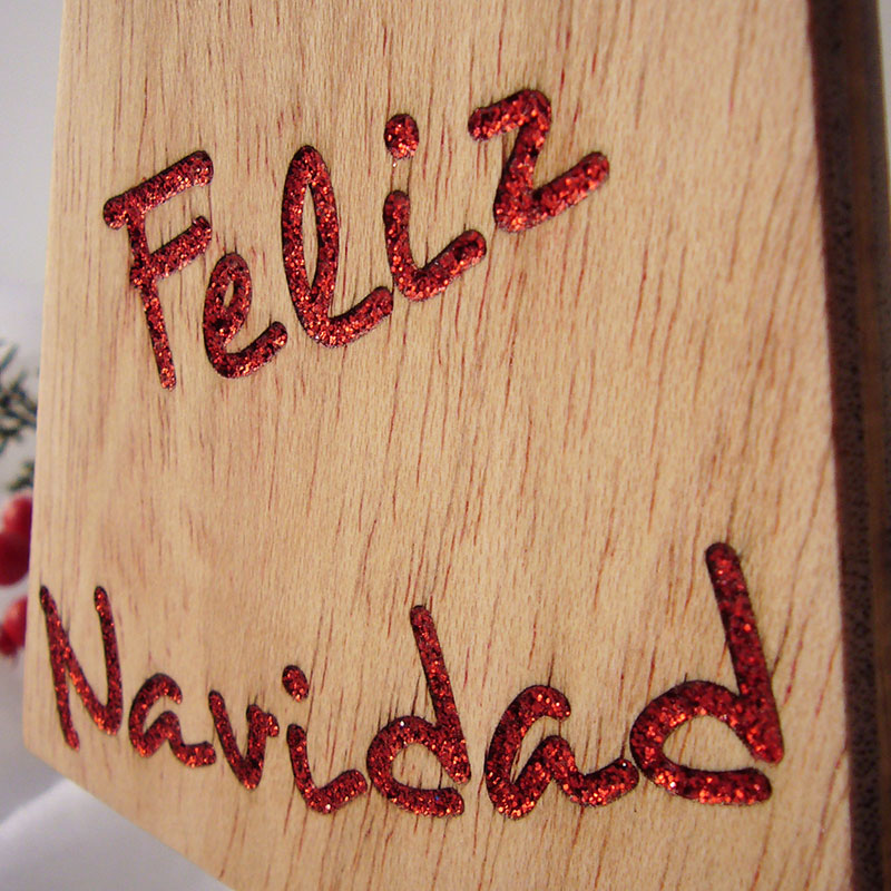 Arbol de navidad de madera con frase roja purpurina pintada sobre hueco