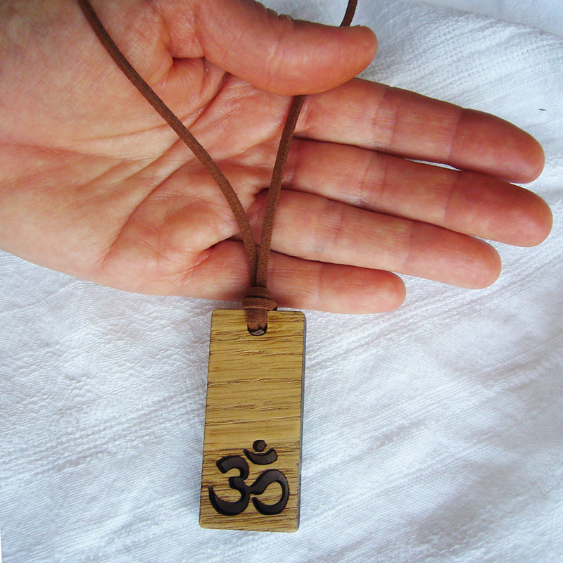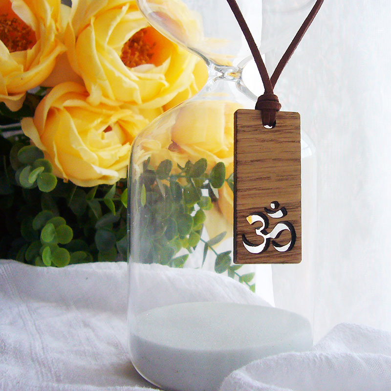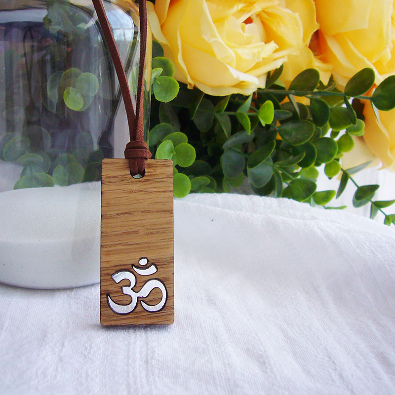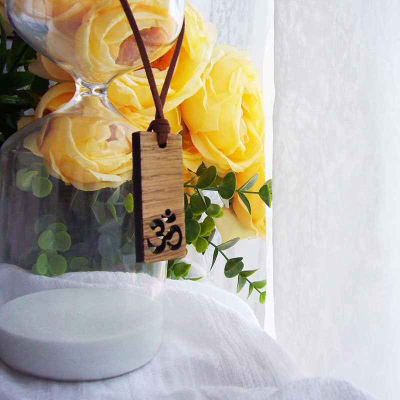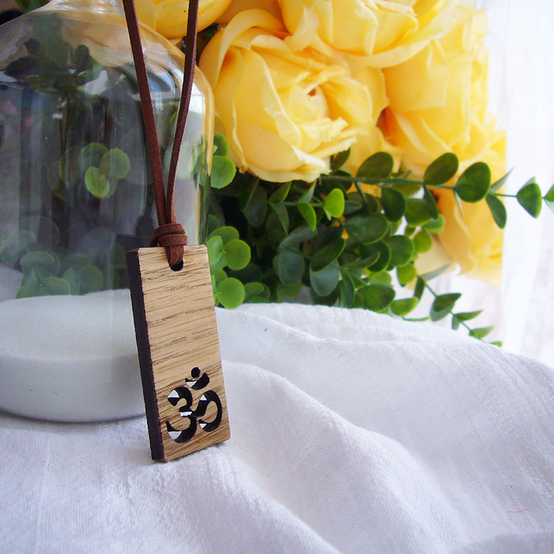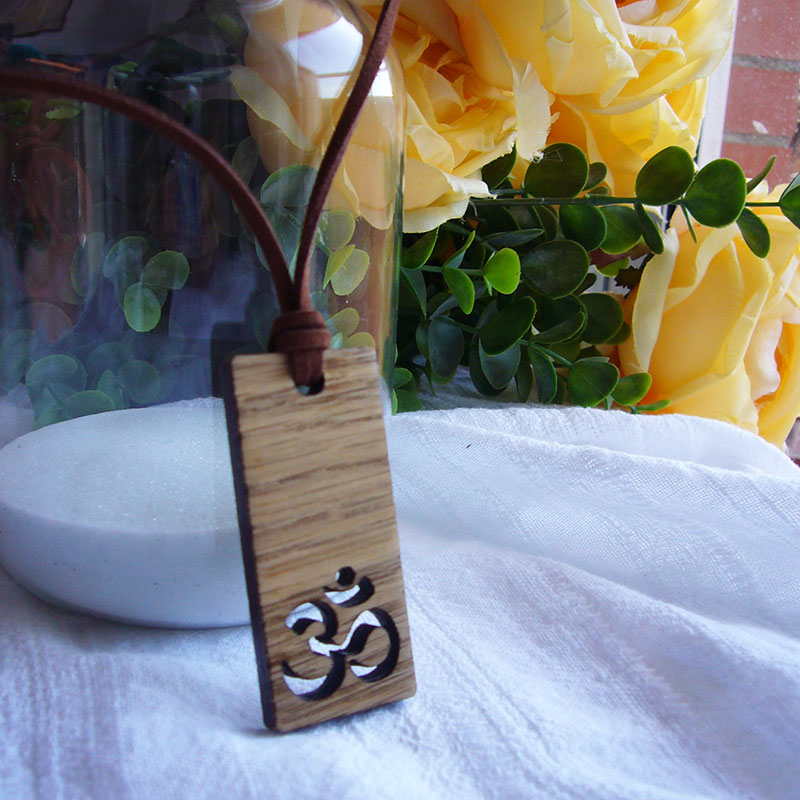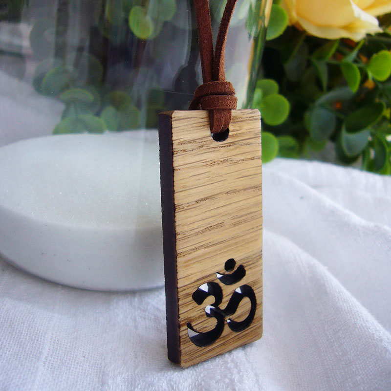 Collar colgante séptimo chakra está hecho en mdf rechapado de roble natural por ambas caras, forma rectangular con silueta calada, llamada Sahasrara, este símbolo se dice que está relacionado con la iluminación y la conexión con tu yo espiritual, con los demás y con la energía divina.