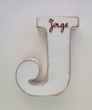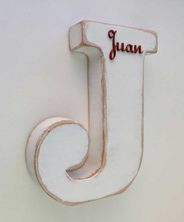 Si te gusta esta Letra J de madera blanca vintage, pero la quieres personalizar con algún nombre grabado o en relieve, haz clic en “añadir grabado” y escribe tu texto en el recuadro emergente, a continuación en “comentarios ” puedes especificar los detalles de tu nombre, si lo quieres grabado (sin color, se queda en hueco y oscuro) o en relieve, dinos donde lo quieres, en la parte trasera, delantera, arriba, abajo… también puedes elegir el color (para los de relieve) solo te costará 8€ más. Hemos puesto algunos ejemplos de esta letra con nombres en relieve en color rojo, creemos que es uno de los que mejor combina.