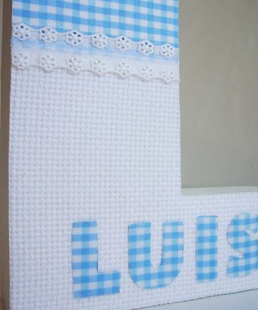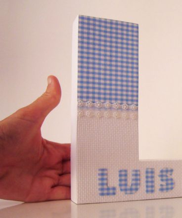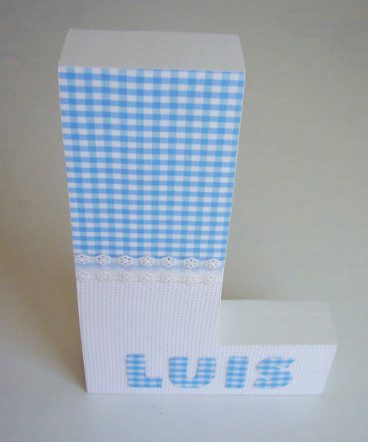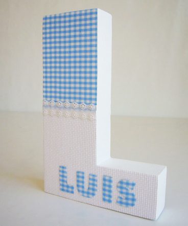 L decorada con nombre Luis con telas pegadas sobre una base de madera, esta decoración puede hacer de la habitación infantil o la mesa dulce un espacio único y original.