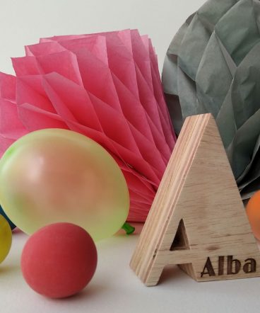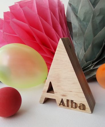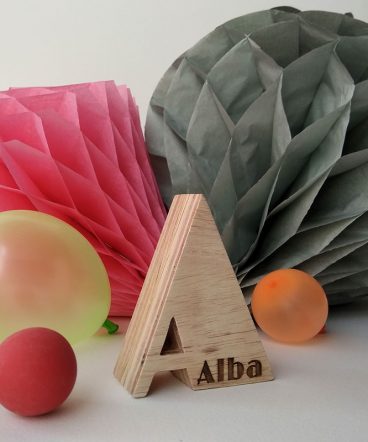 Letra A grabada con el nombre de Alba, hecha en madera de pino natural contrachapada