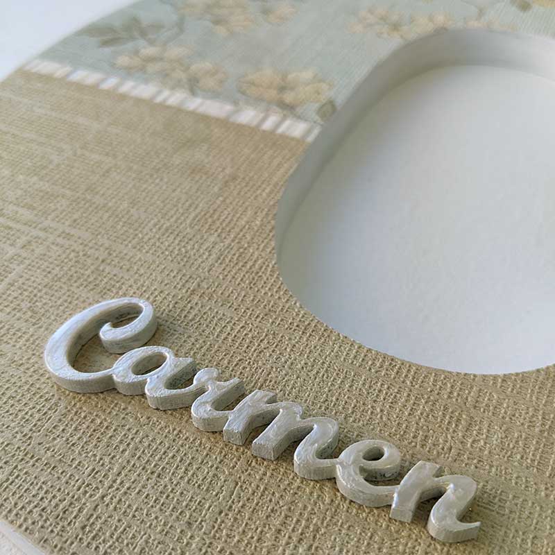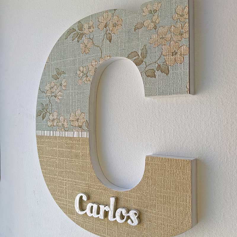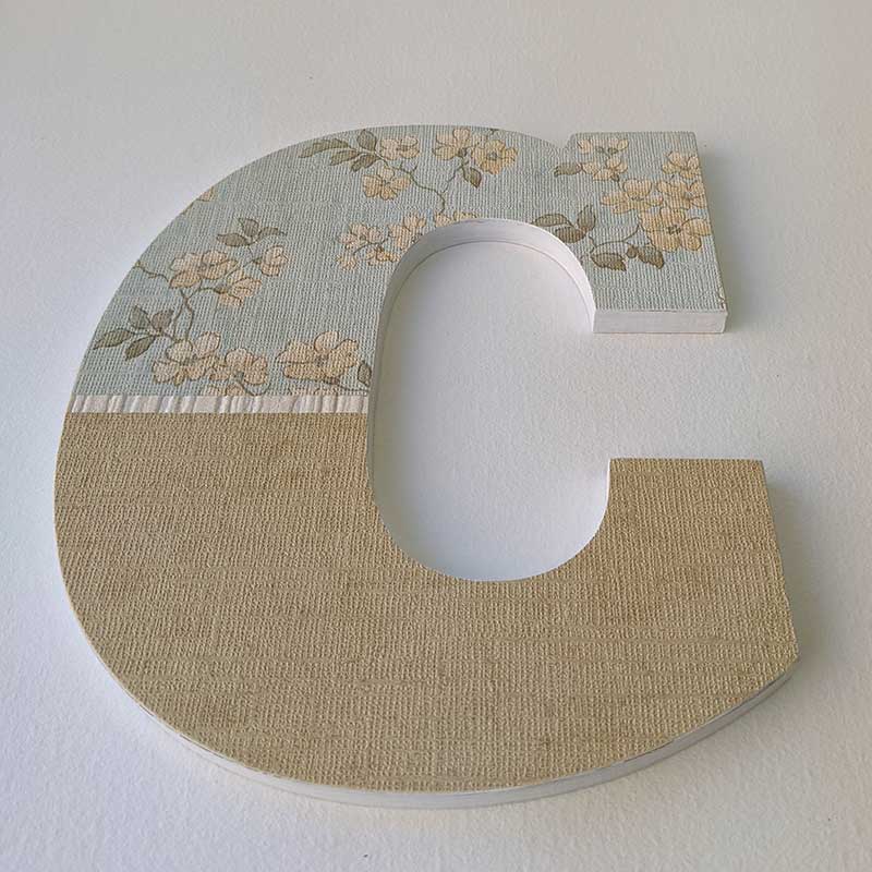 Esta Letra C decoración pared está hecha en madera de pino contrachapado, tratada con productos al agua para su mayor durabilidad de forma natural y sostenible, para ello esta inicial ha pasado por un proceso de varias manos de imprimación, lijados y pintura acrílica blanca, posteriormente se ha procedido a pegar mediante la técnica del decoupage el papel pintado de pared con decoración floral sobre verde azulado claro en la parte superior y color dorado en la parte inferior, intentando de esta forma dar a esta letra el aspecto de las paredes del hogar. Su terminación es de fácil mantenimiento y limpieza teniendo en cuenta que hemos utilizado papeles pintados que se usan para las paredes.