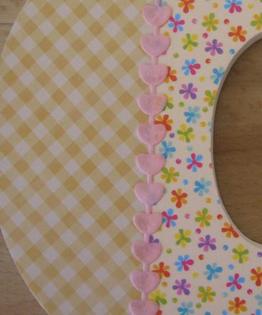 Letra C decorada con cuadritos y flores, color predominante el beige