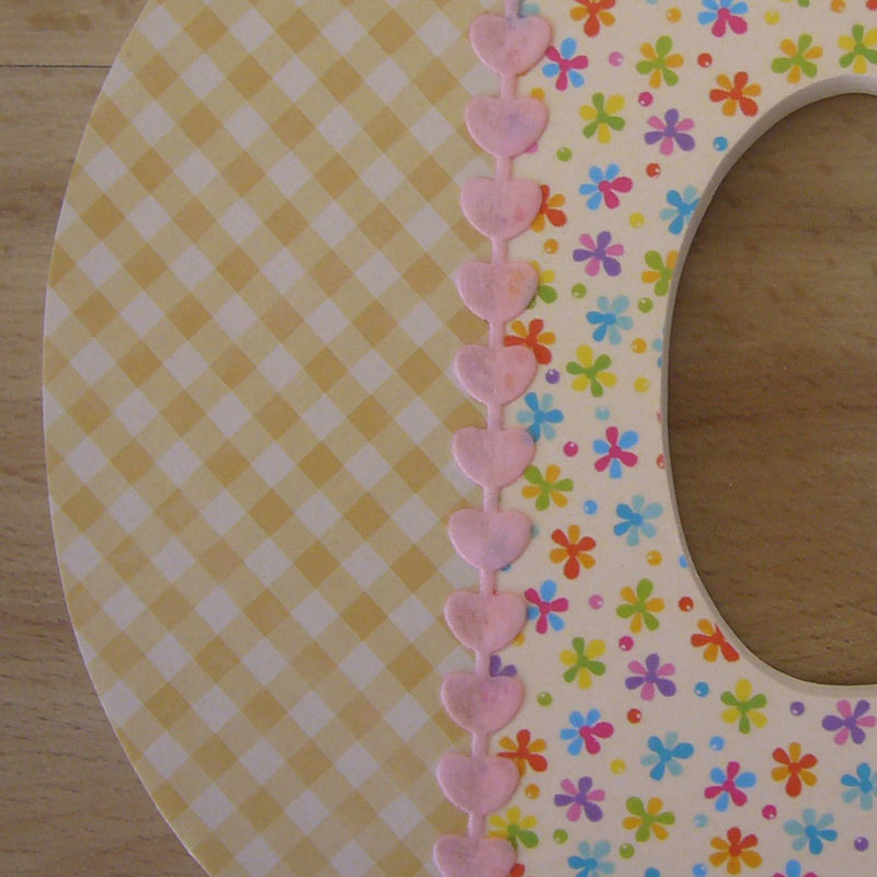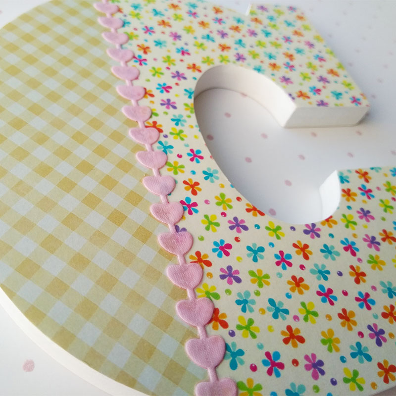 Esta inicial está decorada con papeles especiales para la técnica del decoupage, está hecha de madera de contrachapada de pino, en su tratamiento lleva varias manos de imprimación, lijados, pintura blanca y barniz satinado, todos productos al agua de primeras marcas alargar su durabilidad de forma natural y sostenible, manteniendo las cualidades de la madera intactas y consiguiendo de esta forma una terminación muy suave y agradable al tacto, fácil de limpiar y de mantener en el tiempo.