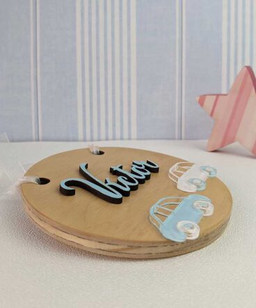 Ejemplo de Letrero con cochecitos de metacrilato hecho en madera de pino de exterior de 1 cm de grosor con el nombre en MDF pintado a mano con esmaltes al igual que la parte trasera de los cochecitos de metacrilato.