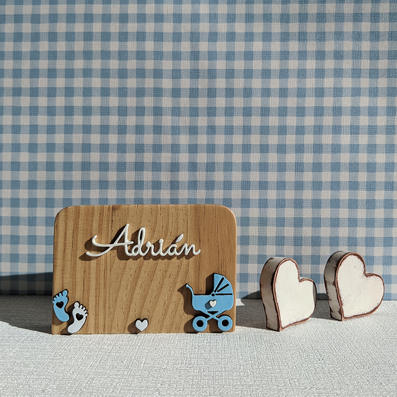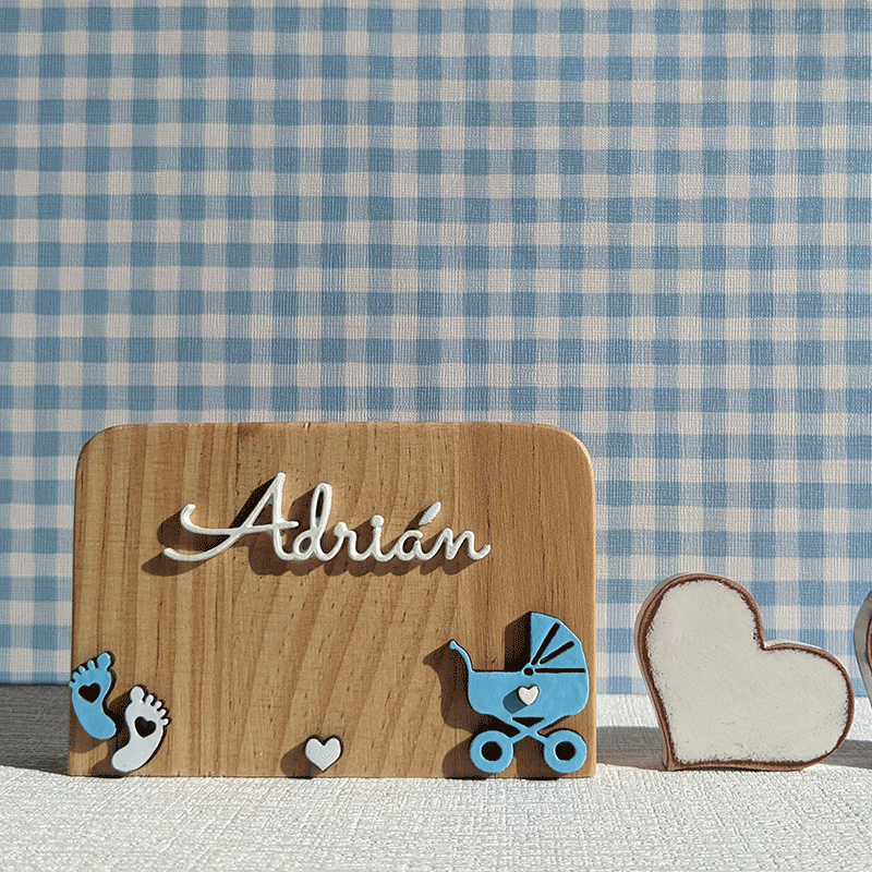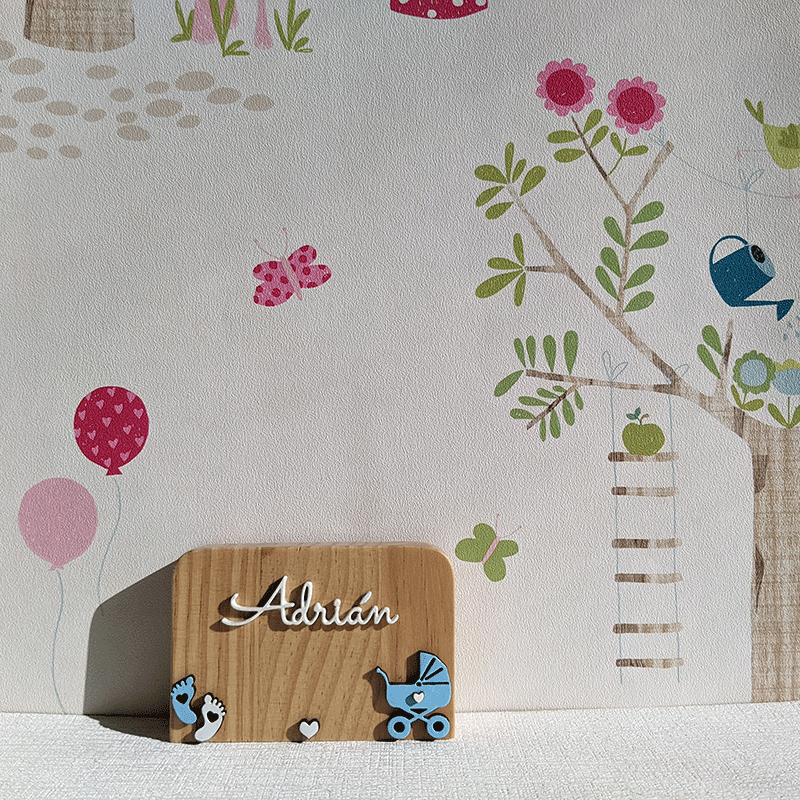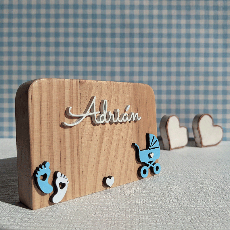 Letrero para bebé personalizable con el nombre que quieras, hecho en madera de pino de 1 cm de grosor, decorado con los detalles y nombre en MDF pintados a mano y perfilados.
