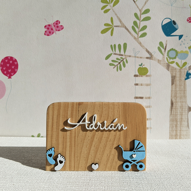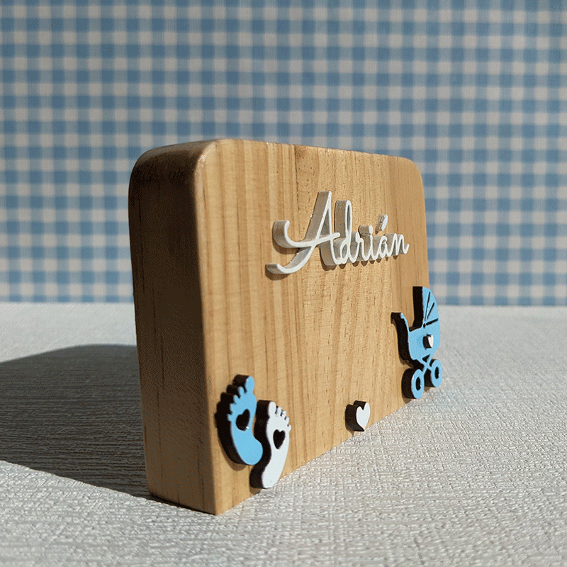 Ponemos este ejemplo de letrero para bebé con el nombre de Adrián para que sirva de ejemplo para que te sea más fácil a la hora de elegir tu regalo, tu elección será una pieza única y original, el nombre irá en el color que prefieras. Este letrero es para poner de pie, encima de la mesilla de noche (no pesa nada) estantería, mueble o para el espacio que mas te guste. Si prefieres este letrero para colgar o para pegar en la pared solo tienes que decírnoslo, llámanos o contacta con nosotros para indicarnos tus preferencias, te escuchamos. Ojo esto no es un juguete