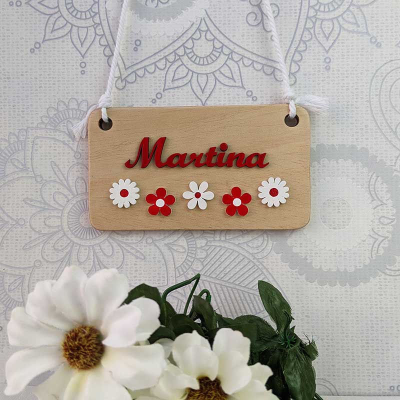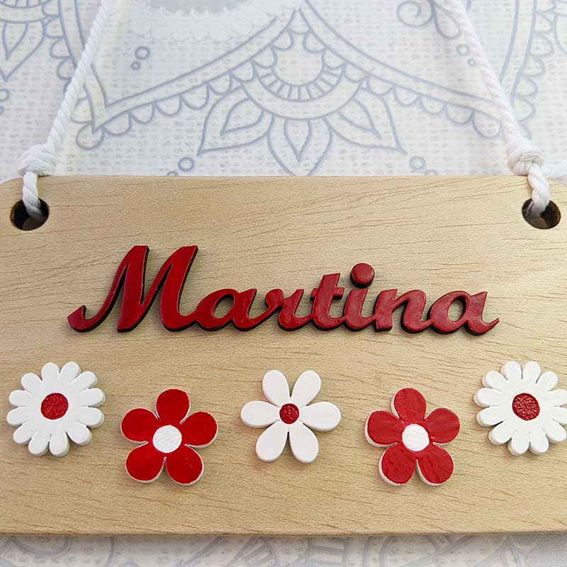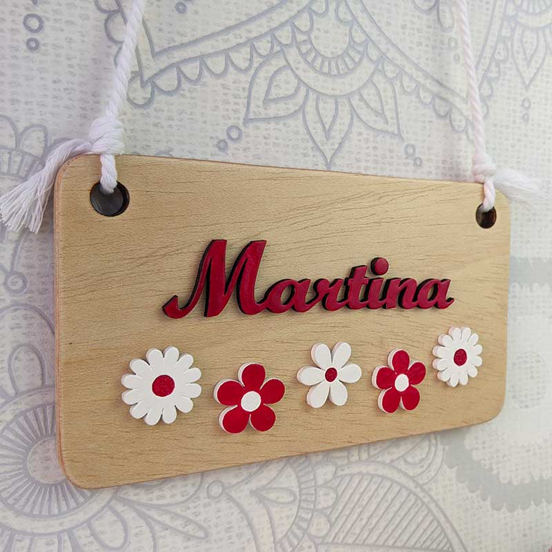 Letrero personalizado con Martina hecho en madera de pino de 1 cm de grosor decorado con flores y nombre hechos en MDF y pintados mano a mano uno a uno con esmaltes