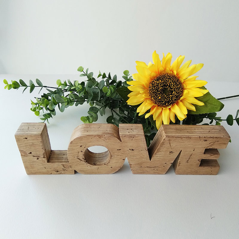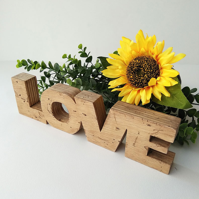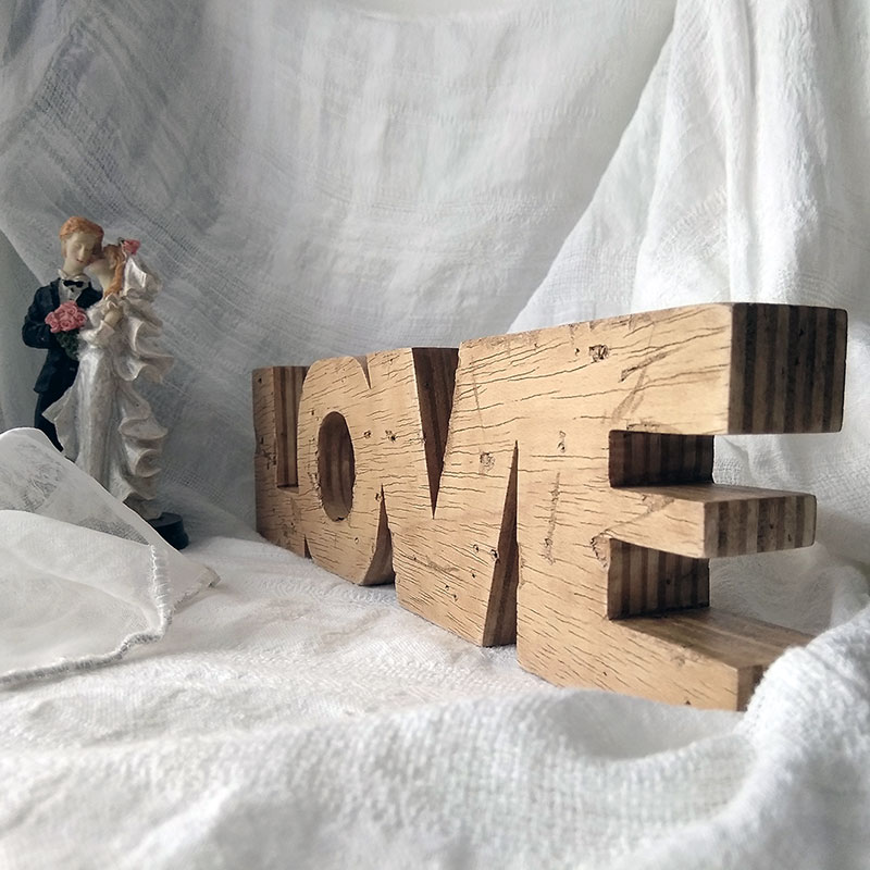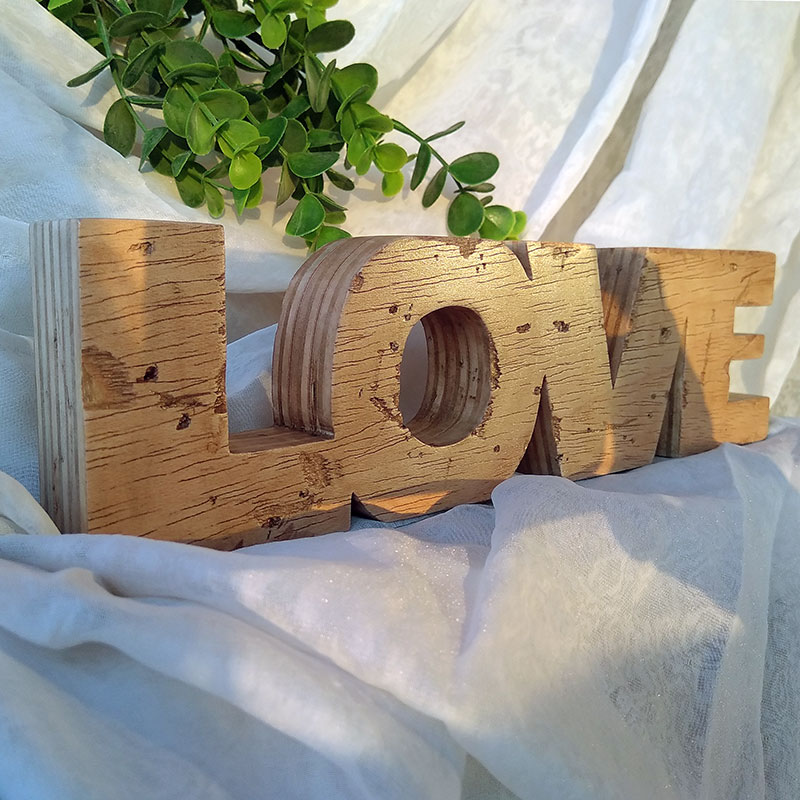 Love envejecido estilo vintage hecho con madera de pino contrachapada y envejecida, con tratamiento de productos al agua de primeras marcas para su mayor conservación, consiguiendo una terminación muy suave y agradable al tacto.