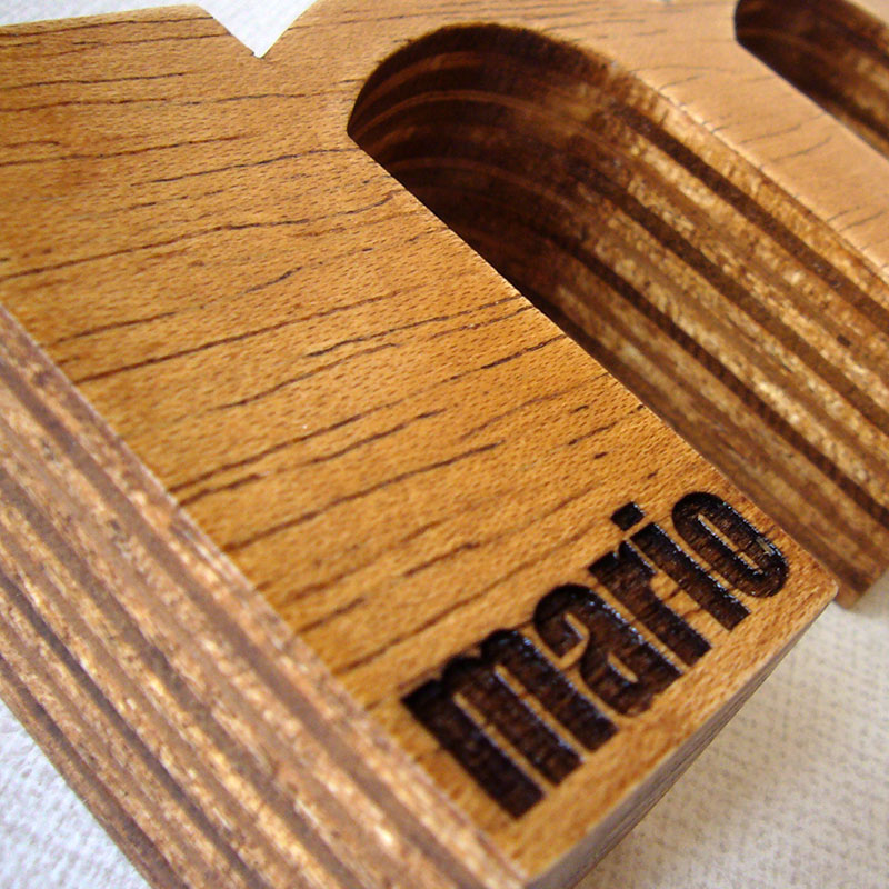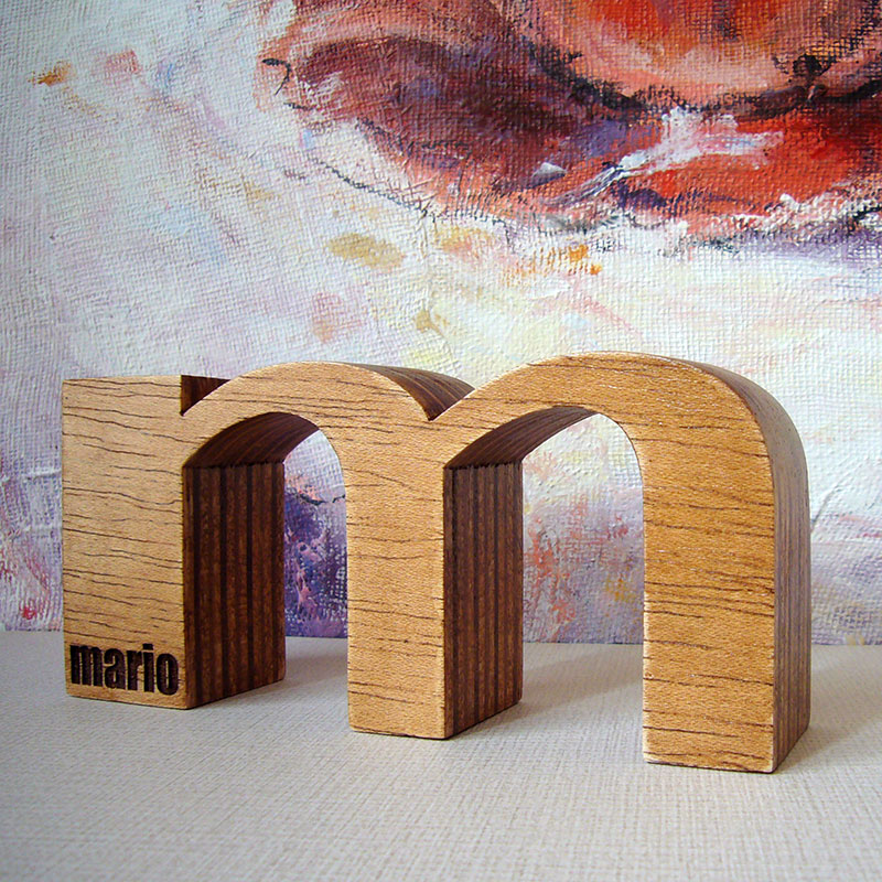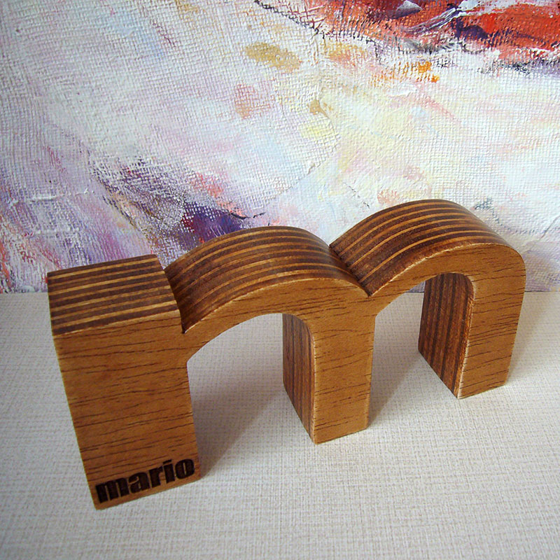 M de Mario de madera oscurecida y grabada.