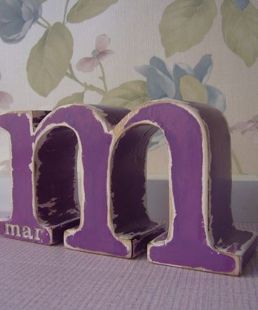Mar grabada en m malva envejecida estilo vintage, color lila sobre color blanco con bordes desgastados donde se deja entrever el color de la madera y el blanco