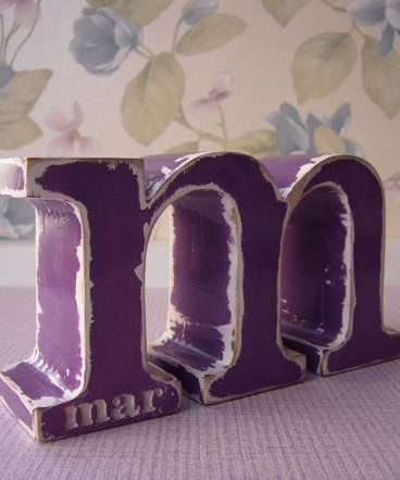 Letra decorada con pinturas a la tiza a la que previamente se le han dado varias manos de imprimación, intercaladas con sus lijados, pinturas y barnices correspondientes, todos productos al agua de primeras marcas para preservar las cualidades de la madera y favorecer su durabilidad de forma natural.
