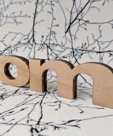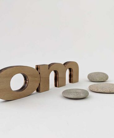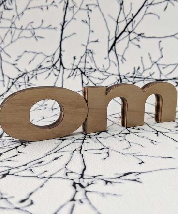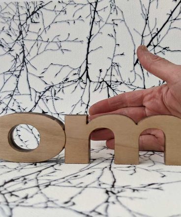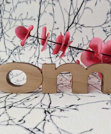 Mantra om hecho en madera natural de pino, con sus manos de imprimación, lijados y barniz correspondiente, en este caso el barniz es satinado. Todos los productos que utilizamos para la mayor durabilidad de nuestras letras son de primeras marcas y al agua.